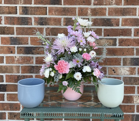 A compact take on our English countryside, perfectly pastel has it all and will fit perfectly on your desk or small table. Made with care with a mixture of very own Mischler fresh cuts and bought in daily fresh flowers. Send this charming container to someone today! Container color will vary